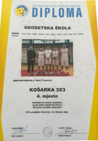 Na Prvenstvu grada Zagreba u košarci 3×3 za mladiće srednjih škola, koje je okupilo više od 50 školskih ekipa, učenici naše škole 18. ožujka 2026. ostvarili su zapažen rezultat. U iznimno jakoj konkurenciji naši su dečki pokazali timski duh i sportsku kvalitetu te na kraju osvojili 4. mjesto. Ekipu su činili učenici: Leon Gruić, Matija Jelenek, Ante Jularić, Slavko Jurič, Ante Perić, Matija Ružđak, a tim je vodio nastavnik Orest Žunković.