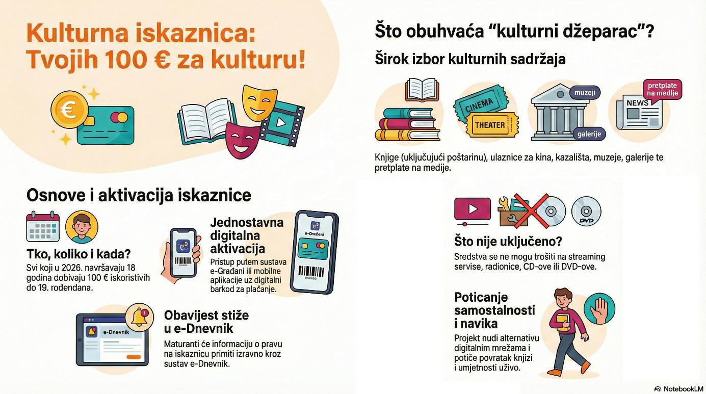 - Vrijeme korištenja: Početak korištenja Kulturne iskaznice predviđen je za travanj 2026. godine, a odobreni iznos mladi mogu koristiti tijekom godine dana, točnije do svojeg 19. rođendana.