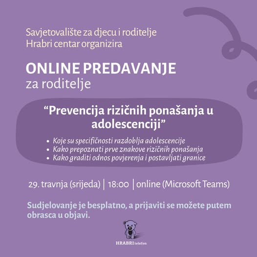 Savjetovalište za djecu i roditelje Hrabri centar organizira predavanje na temu Prevencije rizičnih ponašanja u adolescenciji.